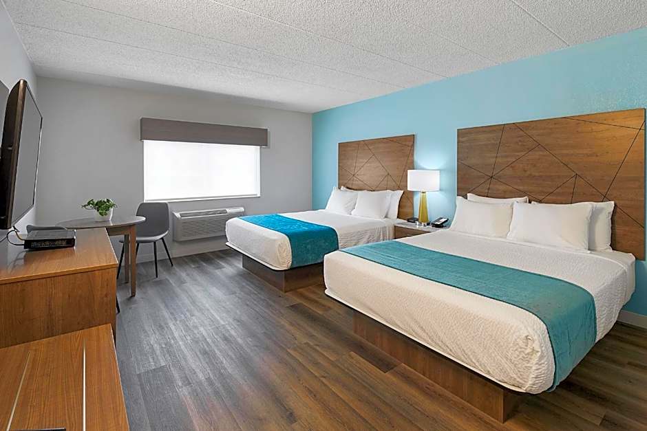 This room features a flat -screen TV, a microwave, and a refrigerator.